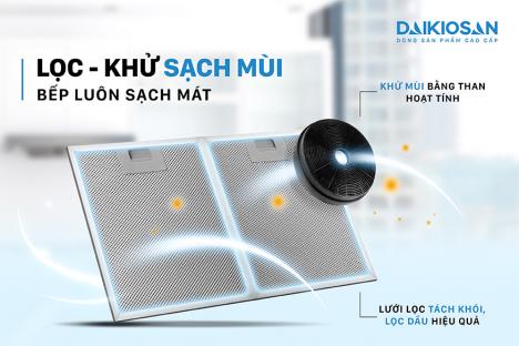 Ngoài khả năng hút mùi, máy hút mùi Daikiosan DKH-000007 còn có thể tách khói lọc dầu và khử mùi hiệu quả khi được bố trí tận 2 hộp than hoạt tính nằm phía trước động cơ, giúp tái tạo lại không khí trong gian bếp trở nên sạch sẽ, trong lành.