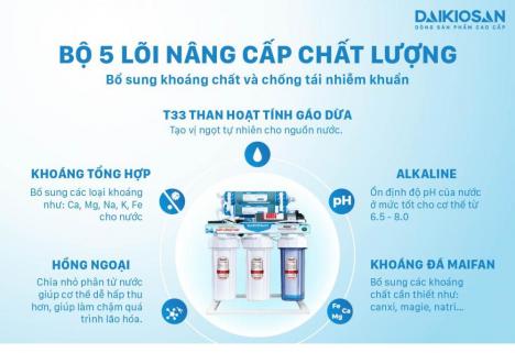 Máy lọc nước Daikiosan DSW-34009D có 5 lõi nâng cấp gồm: Lõi T33 than hoạt tính gáo dừa dạng nénlõi Alkalinelõi Khoáng đá Maifanlõi Hồng ngoạilõi khoáng tổng hợp có chức năng bổ sung khoáng chất, cân bằng PH, tạo vị ngọt và tái nhiễm khuẩn để tạo ra nguồn nước đầu ra nhiều lợi ích cho sức khỏe người dùng.